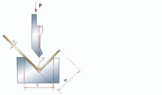 3、折弯压力近似计算公式:P=650s2L/1000v其中各参数的单位 P——kN  S——mm  L——mm  V——mm