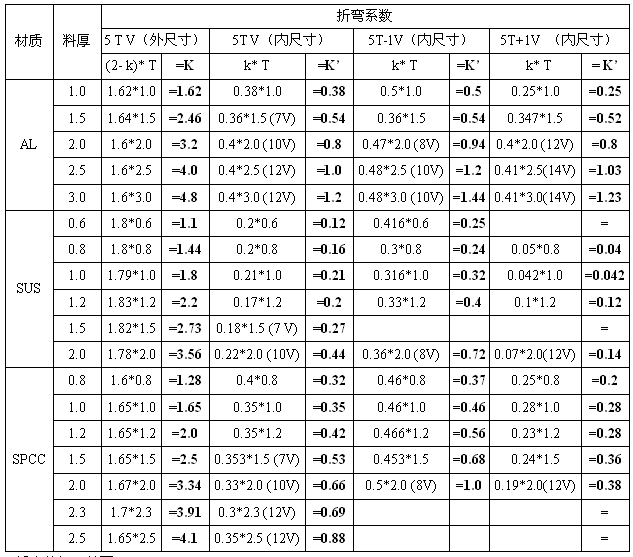 K——系数(查折弯系数K、K’一览表)